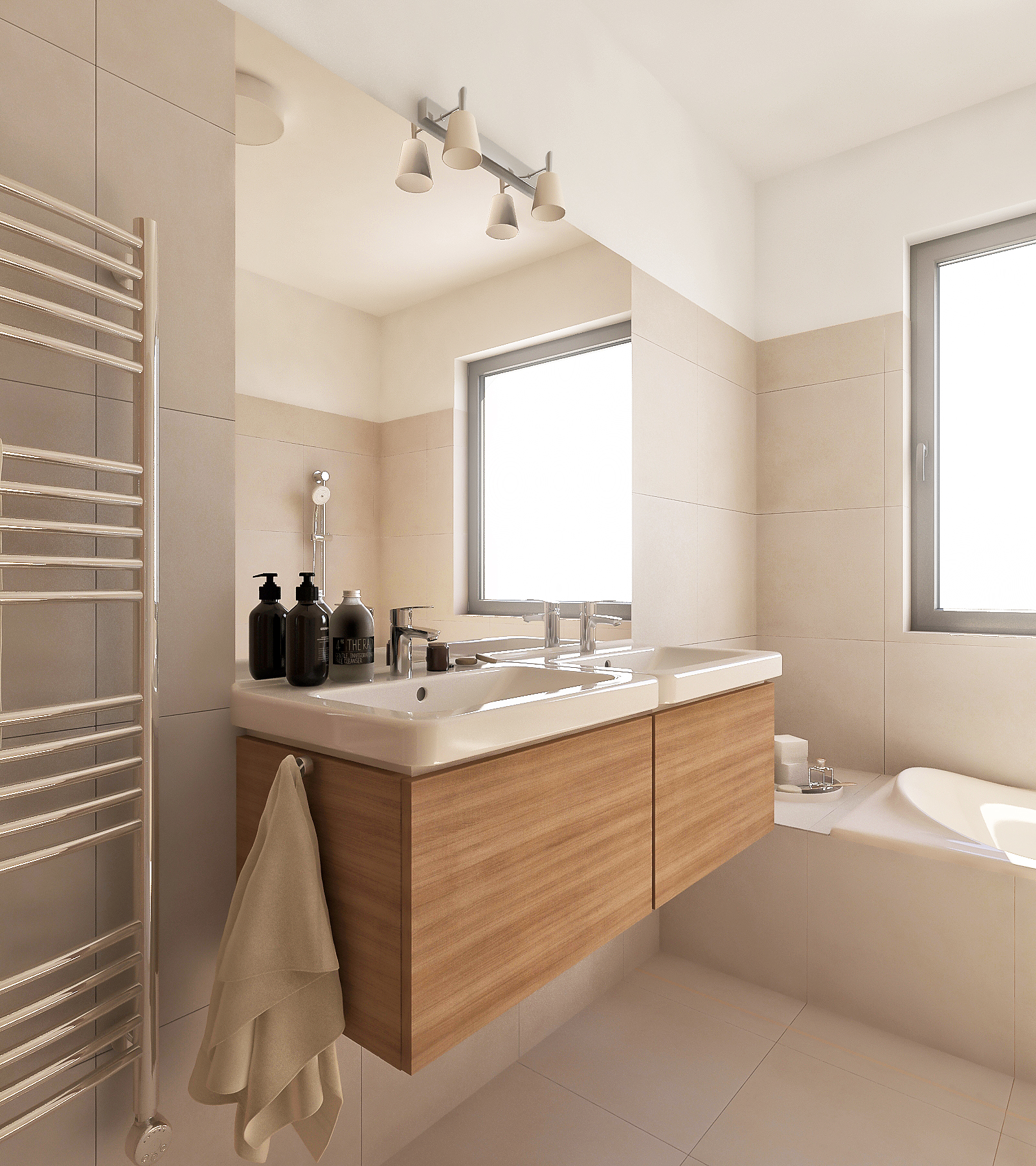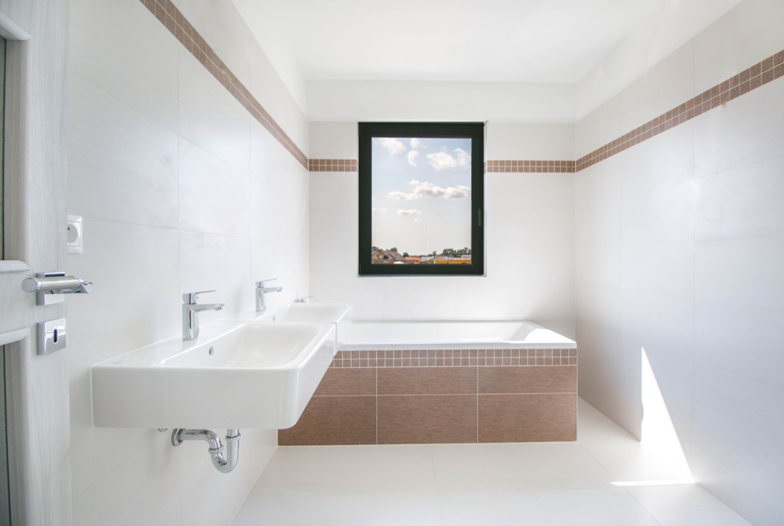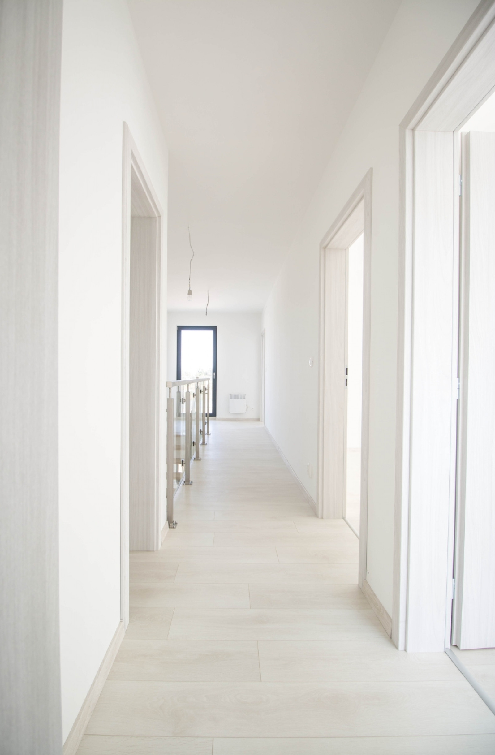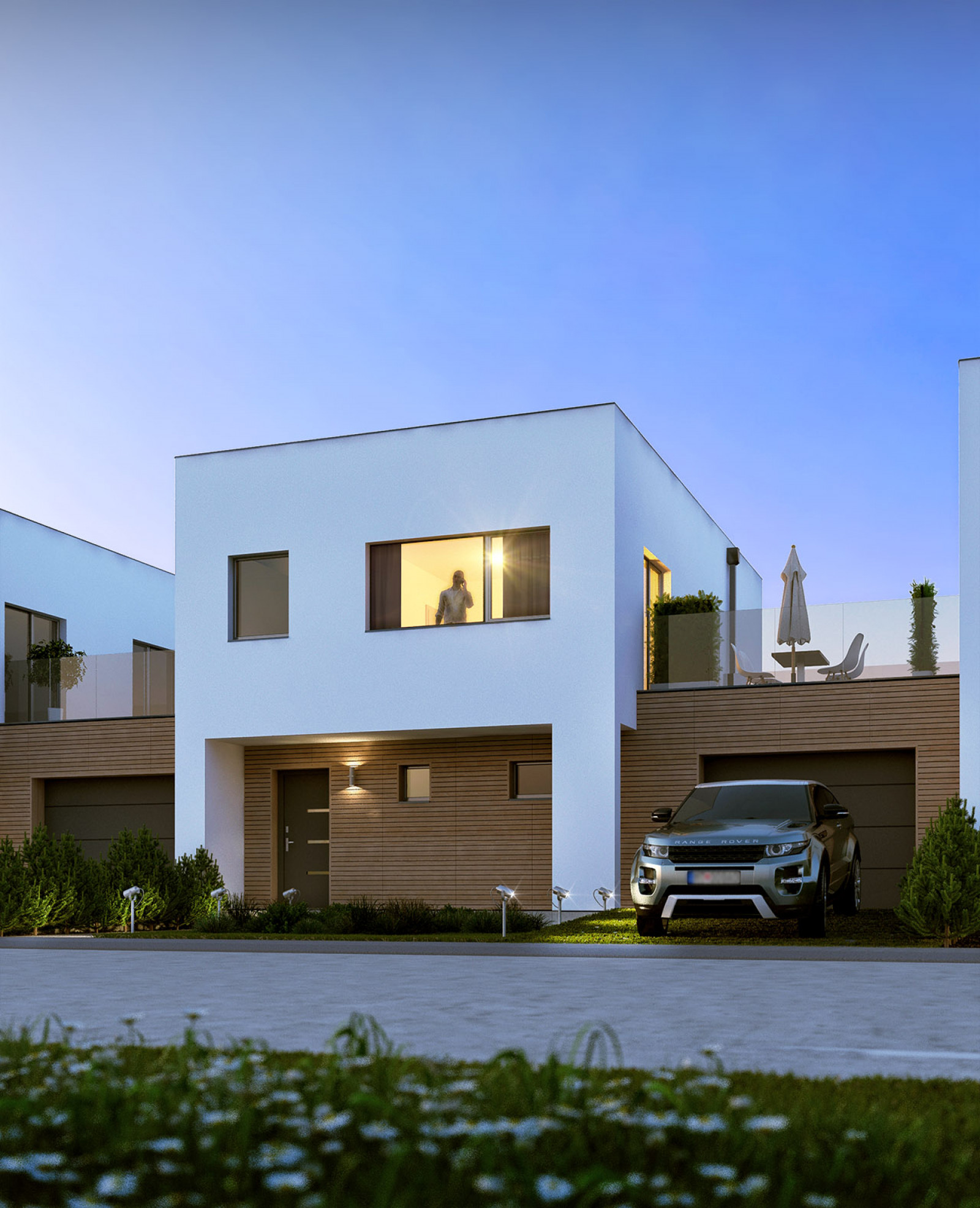 Na poschodí sa nachádza 2 x detská izba, priestranná spálňa a ďalšia kúpeľňa (so sprchovým kútom aj vaňou) a WC. Z prvého poschodia je tak isto prístup na terasu, ktorá sa nachádza nad garážou. Radové domy sú oddelené jednotlivými garážami a menšou medzerou, takže všetky stoja samostatne.