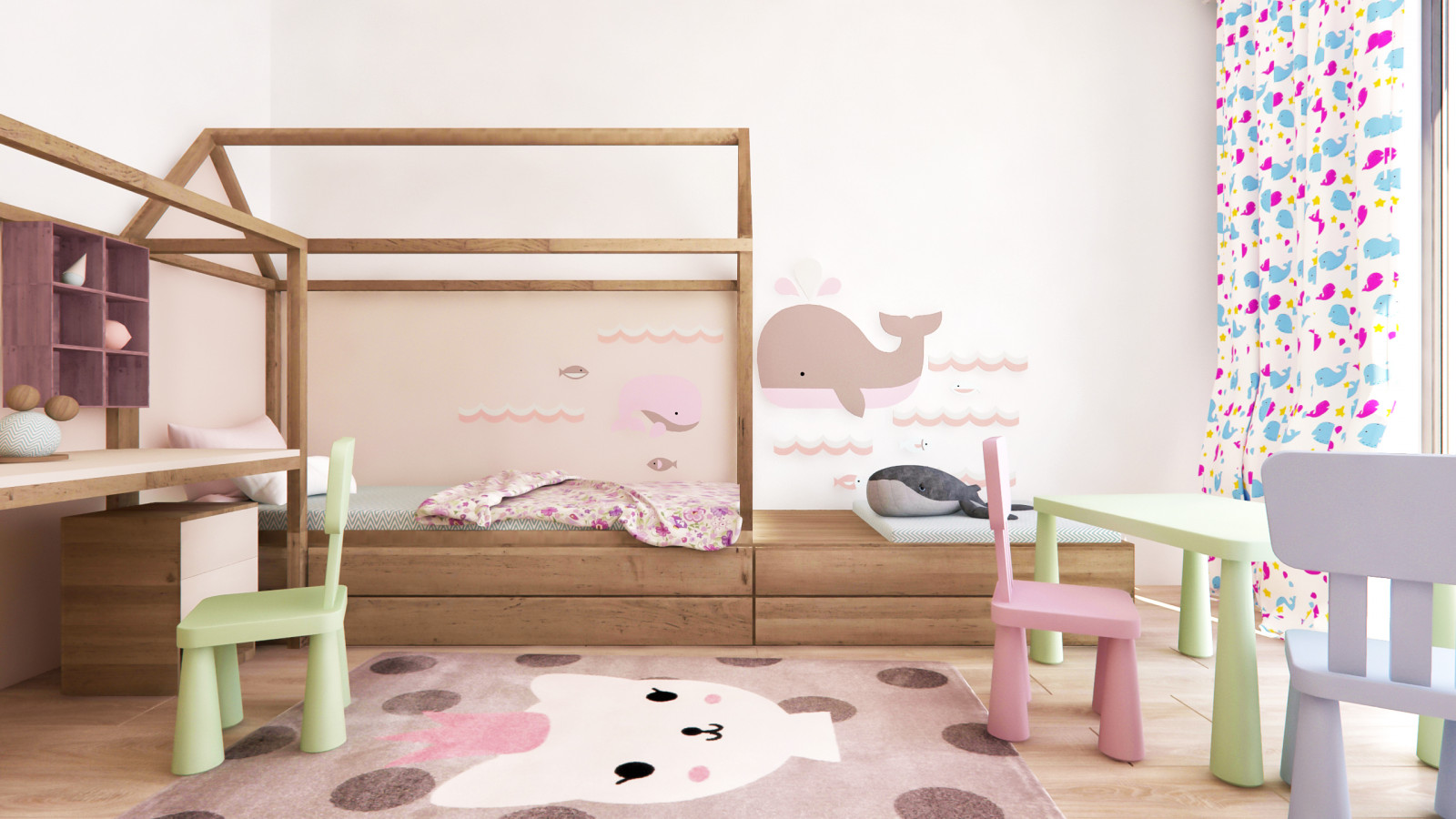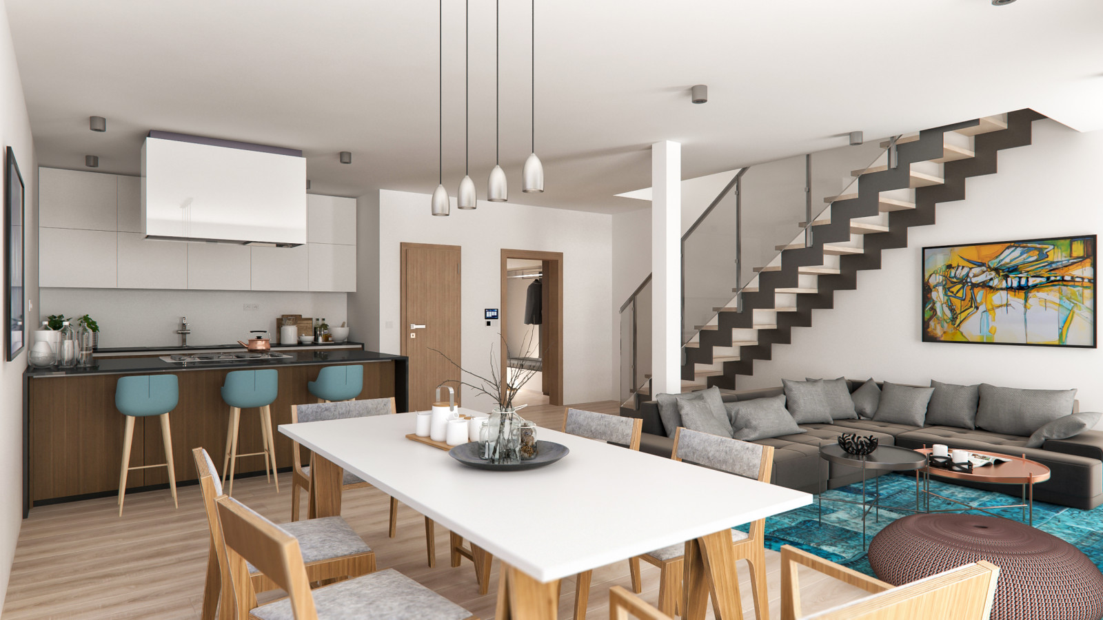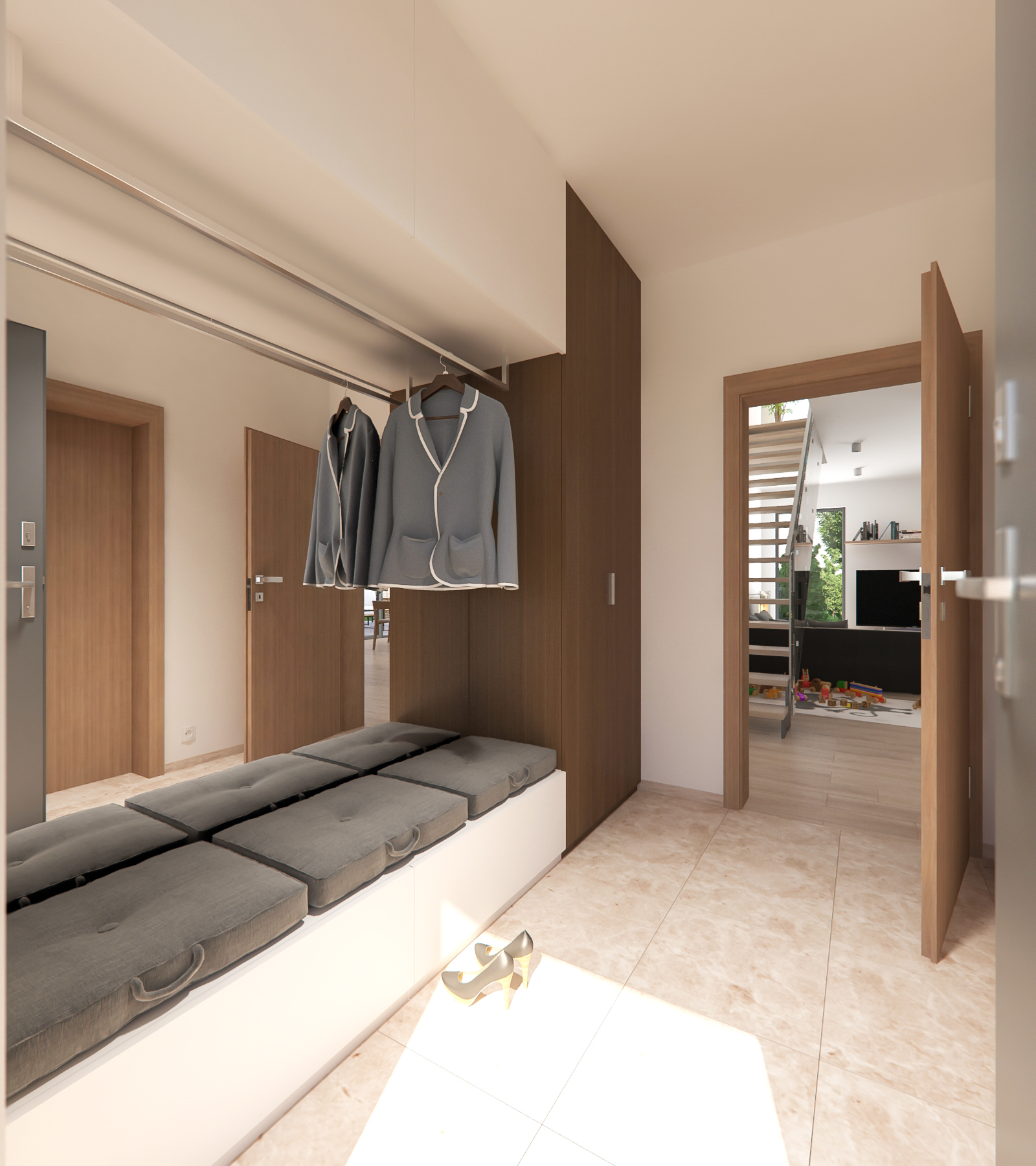 Hlavnou devízou tohto bývania je oddelenosť dennej (prízemnej) a nočnej časti, nachádzajúcej sa na poschodí. Prízemie sa vyznačuje veľkým otvoreným priestorom (obývačka, kuchyňa, jedáleň, WC a kúpeľňa).