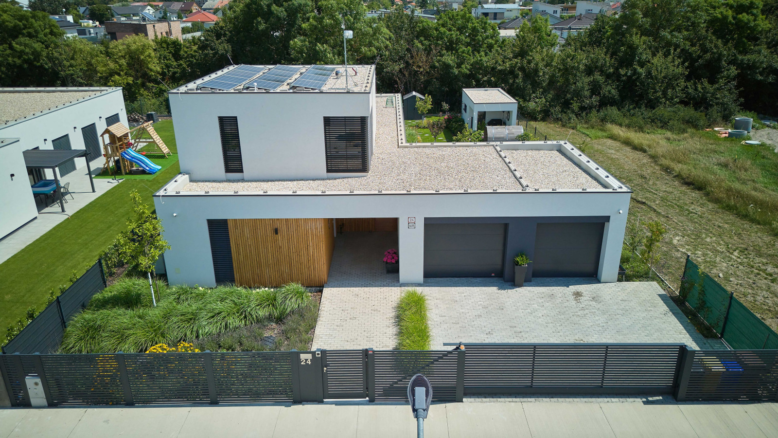 je projekt, ktorý vznikol ako odozva na projekt PEGASUS, kedy bolo pre nás výzvou vyriešiť požiadavku potreby garáže a jeho prepojenie s domom tak, aby neutrpel dizajn domu a bola dodržaná nadčasová architektúra. Tento projekt v reálnom priestore dominuje medzi ostatnými stavbami a vyniká symetrickými líniami, pod ktorými sa skrýva vkusné a zároveň funkčné bývanie. Spodná časť zaujme jednoduchosťou a rovnými stenami v kombinácii s veľkoformátovým presklením a jedinečný moderný dizajn dotvára druhé podlažie, ktoré pôsobí veľmi vkusne a zároveň nenápadne, no poskytuje dostatočný priestor pre svojich obyvateľov. V interiéri je srdcom domu kuchyňa s jedálňou prepojená s obývacou izbou, s rozsiahlym výhľadom na záhradu. Zaujímavým dispozičným riešením umiestnenia spálne s vlastnou kúpeľňou a šatníkom na prízemí, sme docielili dostatok súkromia pre rodičov. Veľkou výhodou stavby projektu PEGASUS PLUS je veľkorysý priestor a premyslené dispozičné riešenie na pozemku s rozlohou už od 700 m².